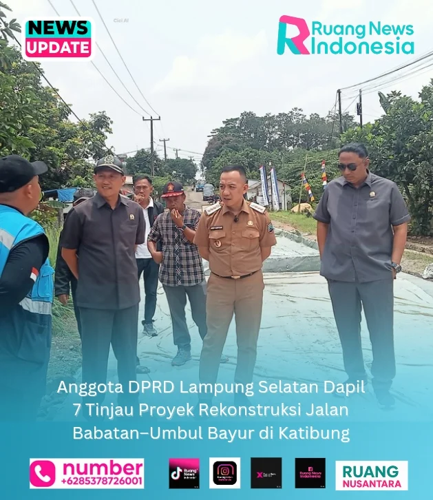 Lampung Selatan, 20 Oktober 2025 (RuangNewsIndonesia.Com) — Anggota DPRD Lampung Selatan dari Daerah Pemilihan (Dapil) 7, yang meliputi Kecamatan Katibung, Candipuro, dan Way Sulan, yakni Ismail, S.E., M.M. dari Komisi III, dan Farizal Purba, S.E. dari Komisi IV, meninjau langsung pelaksanaan proyek rekonstruksi Jalan Babatan–Umbul Bayur (R.127) di Kecamatan Katibung, Senin (20/10/2025).