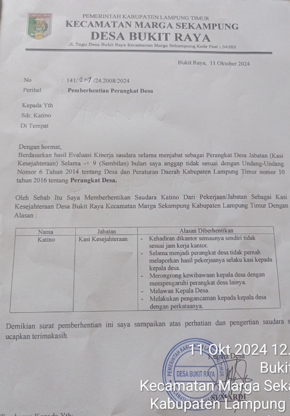 Lampung Timur, RNI.COM – Kepala Desa Bukit Raya yang di duga arogan telah mengeluarkan surat pemberhentian secara sepihak
