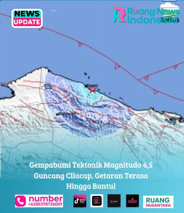 Cilacap, 19 Oktober 2025 (RuangNewsIndonesia.Com) — Wilayah Cilacap, Jawa Tengah, dan sekitarnya diguncang gempa bumi tektonik pada Minggu (19/10/2025) pukul 13.53 WIB. Berdasarkan hasil analisis Badan Meteorologi, Klimatologi, dan Geofisika (BMKG), gempa memiliki parameter dengan magnitudo M4,5.