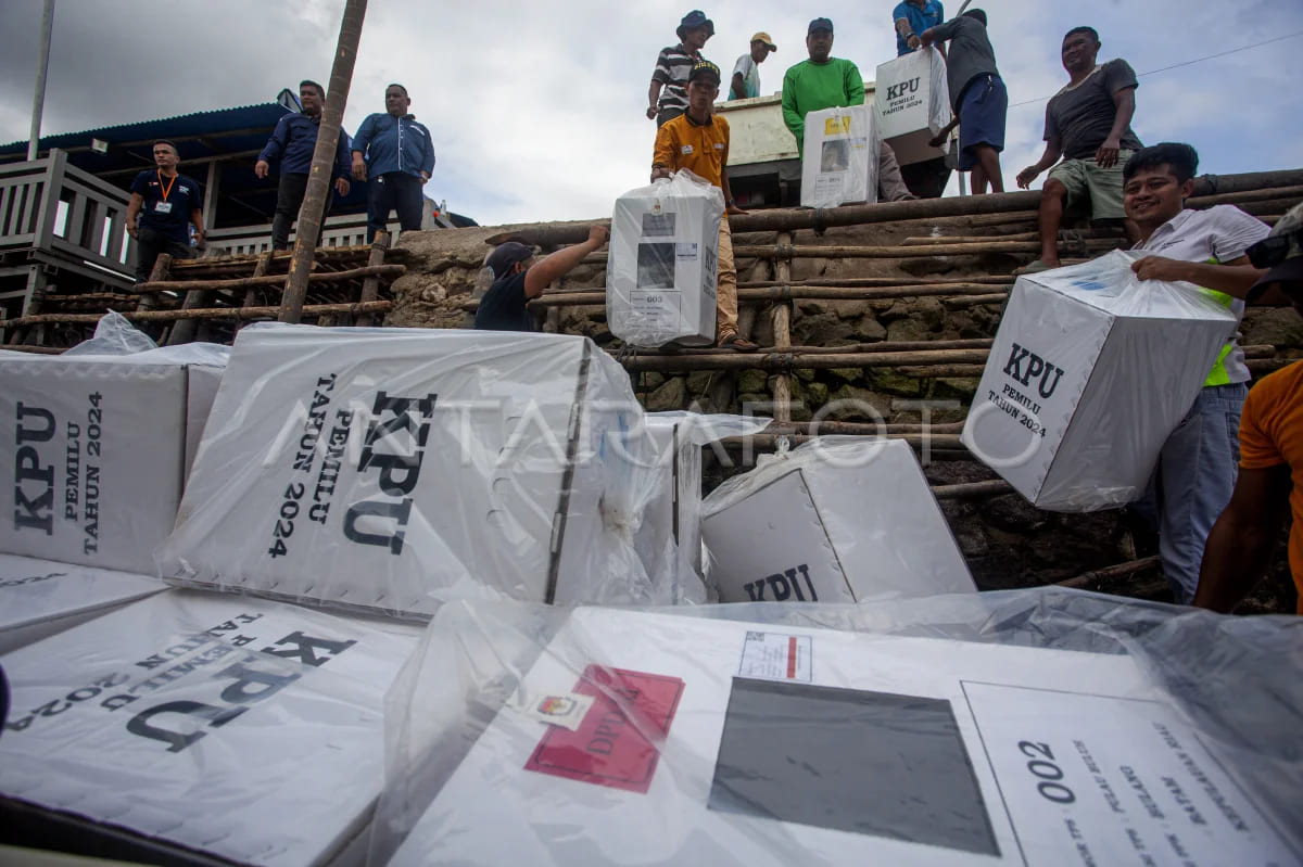 Foto: Pekerja memasukkan logistik Pemilu 2024 ke dalam perahu motor saat akan didistribusikan ke Pulau Bulang, Batam, Kepulauan Riau, Rabu (7/2/2023). KPU Kota Batam menargetkan pendistribusian logistik Pemilihan Legislatif dan Pemilihan Presiden 2024 di daerah Tertinggal, Terdepan, Terluar (3T) yakni Pulau Bulang, Pulau Galang, Pulau Belakangpadang dan Pulau Ngenang selesai pada 8 Februari 2024 dengan menggunakan transportasi laut. ANTARA FOTO/Teguh Prihatna/foc