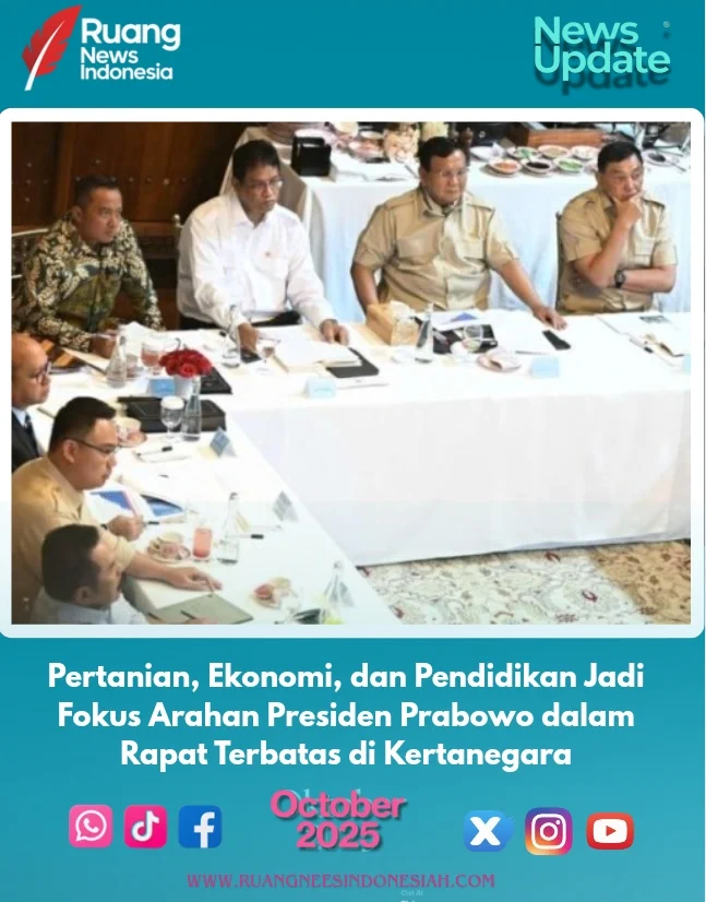Jakarta, RuangNewsIndonesia.Com – Presiden Prabowo Subianto memfokuskan arah kebijakan pemerintah pada penguatan sektor pertanian, ekonomi, dan pendidikan dalam rapat terbatas bersama Kabinet Merah Putih di Kertanegara, Jakarta, Kamis (16/10/2025).