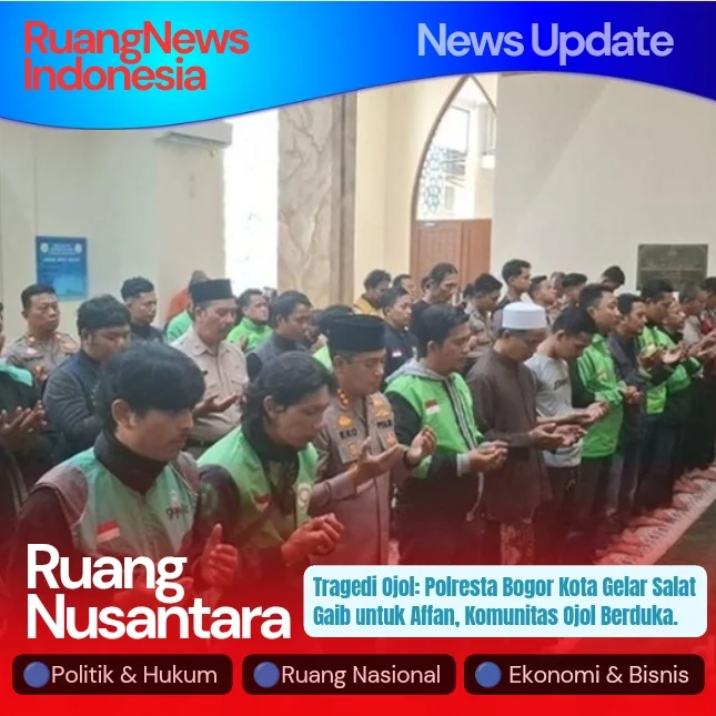 Kota Bogor (RuangNewsIndonesia.Com) – Polresta Bogor Kota menggelar salat gaib untuk mendoakan Affan Kurniawan, seorang pengemudi ojek online (ojol) yang meninggal dunia akibat kecelakaan dengan kendaraan taktis (rantis) Brimob. Salat gaib ini diadakan bersama komunitas ojol Bogor Raya di Masjid Dzikrullah, yang terletak di kompleks Polresta Bogor Kota.
