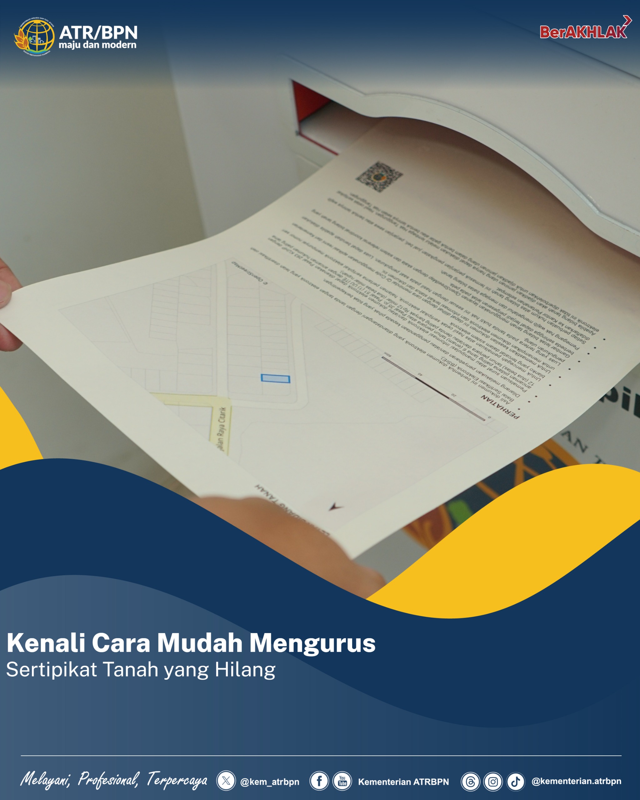 Jakarta, RNI.COM – Sertifikat tanah adalah hal fundamental bagi masyarakat karena menjadi bentuk kepastian hukum hak atas tanah yang sah di mata negara. Sertifikat tanah yang juga memiliki nilai ekonomi ini perlu dijaga oleh masing-masing pemilik. Apabila seseorang kehilangan sertifikat tanahnya, ia harus segera mengurus dan menerbitkannya kembali.